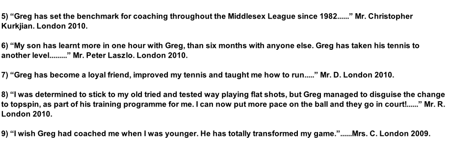 3) “Greg has taken my children under his wing and has given them the confidence to make a difference in a match situation. In contrast to many other coaches Greg not only drills the children he coaches but teaches them match-play skills. He understands the psychology of children and has nurtured their passion for the sport. He has created such a rapport with my eight year old son that he will gladly give up his precious after school free-time to come and play tennis with Greg five times a week because he senses that Greg will protect him, as Greg instinctively knows what the child needs......” Mrs. Sonia Revelli. London 2010.